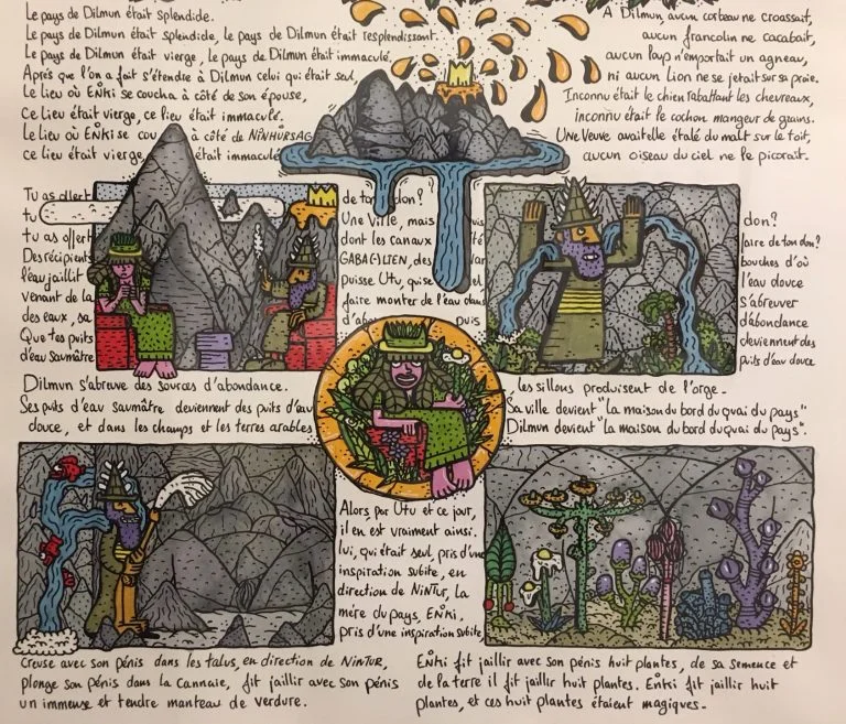 “un carnet de voyage in-situ, plongée iconoclaste, colorée et à rebours entre -12000 et -5000 avant Assourbanipal, du temps des dieux au temps des premiers hommes”
