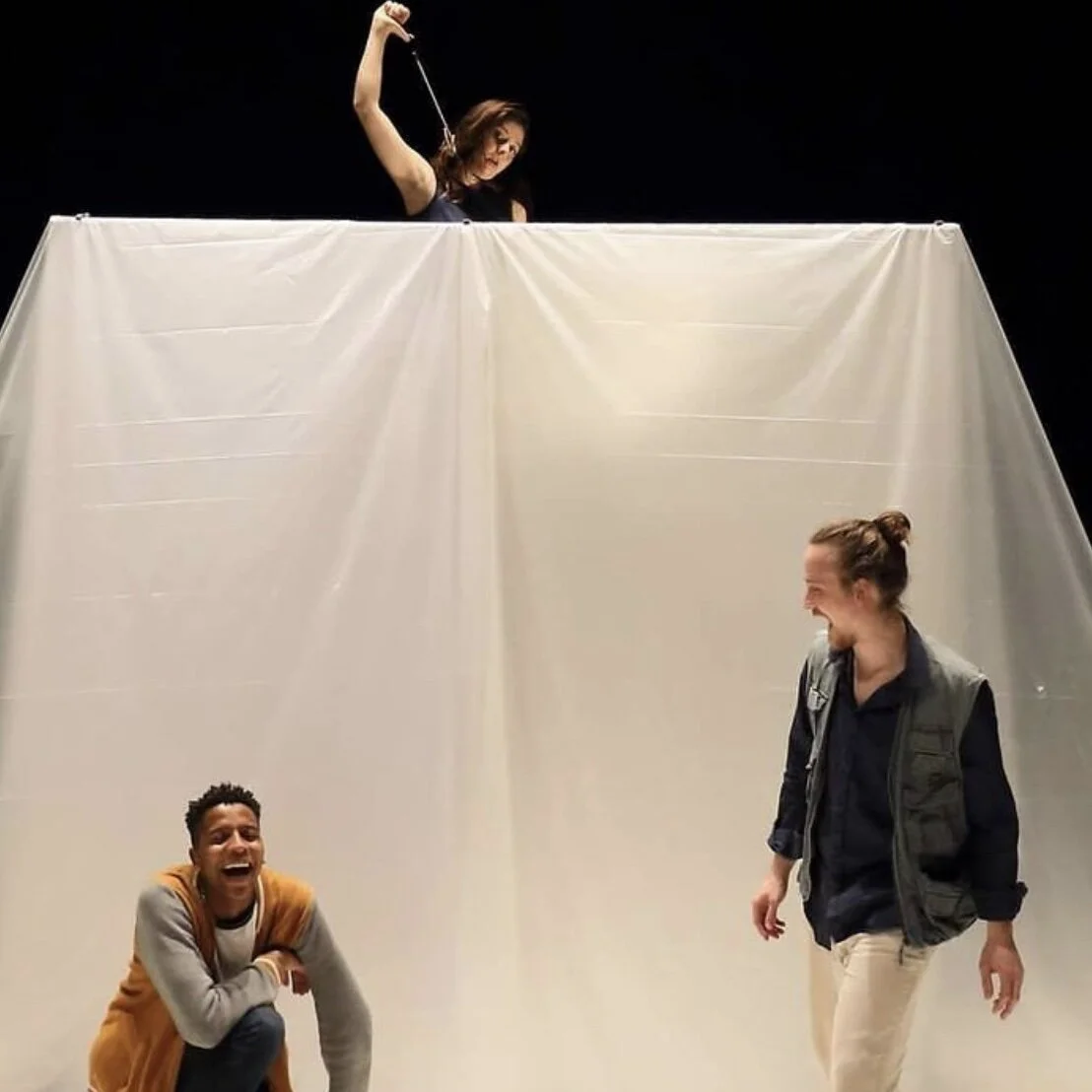 C’’est là le premier souci : à défaut d’avoir un propos, un fil conducteur, on confie au public la lourde responsabilité de la narration. C’est un récit à branches, nous dit-on. Sauf que celles qu’on nous tend, bien loin de nous aider à construire un sens; nous proposent de plonger dans les pitreries abrutissantes de la génération Jackass/ Hanouna. Le prologue, présentant les trois comédiens statiques face au public déclamant des bribes d’introspection, nous confirme qu’outre un problème de mise en scène, l’écriture au plateau n’a pas accouché d’un propos.