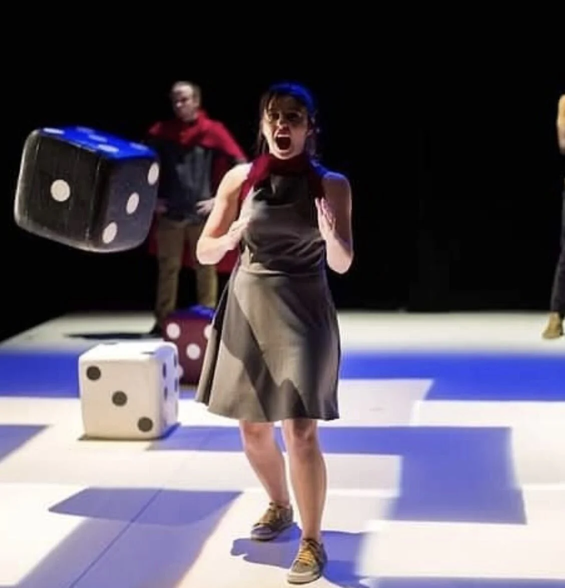 Mais là où le théâtre d’impro limite la participation du public au vote, les déboussolé-e-s confondent public théâtral et plateau télé, nous abrutissant d’ordres débilitants. On nous incite à jeter des dès géants sur scène pour qu’ils se gifflent, à frapper dans nos mains, à ânonner l’alphabet pour les faire avancer. Assis ! debout ! Couché! Rien n’a évolué depuis la farce du Cuvier.