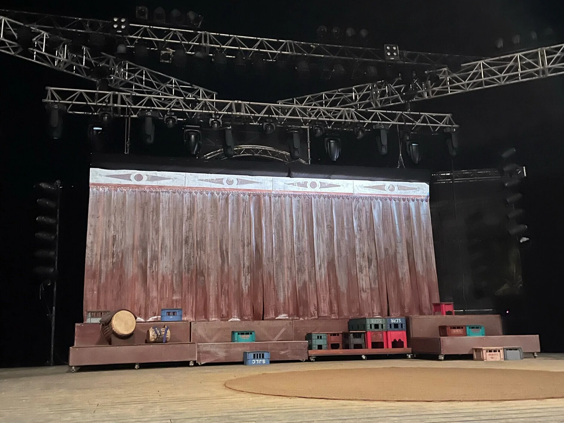 ZERBINETTE : Bonne nouvelle, le public était au rendez-vous dans l’amphithéâtre bondé de Saint -Gilles, où mille personnes attendaient avec un enthousiasme affiché l’ovni culturel proclamé. Sur le plateau, l’ancrage réunionnais est posé d’emblée par le rond coq, tapis de poussière qui génère de beaux effets de lumière quand s’affrontent les adversaires. Cependant, les modules en cageots et le rideau de fond façon chambre froide de supermarché célèbrent le règne du plastique peint, ce que j’ai trouvé assez vilain. Qu’en penses-tu cher copain ?