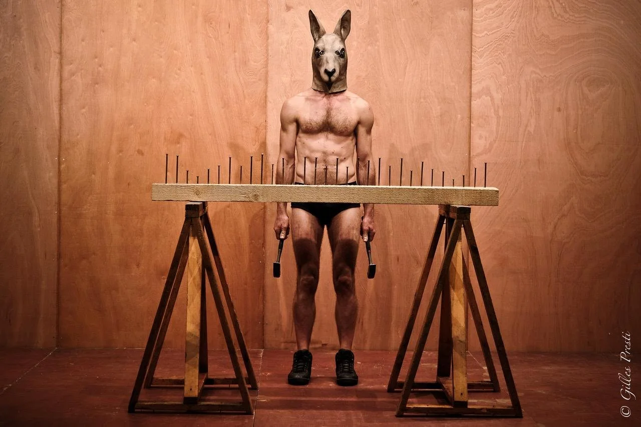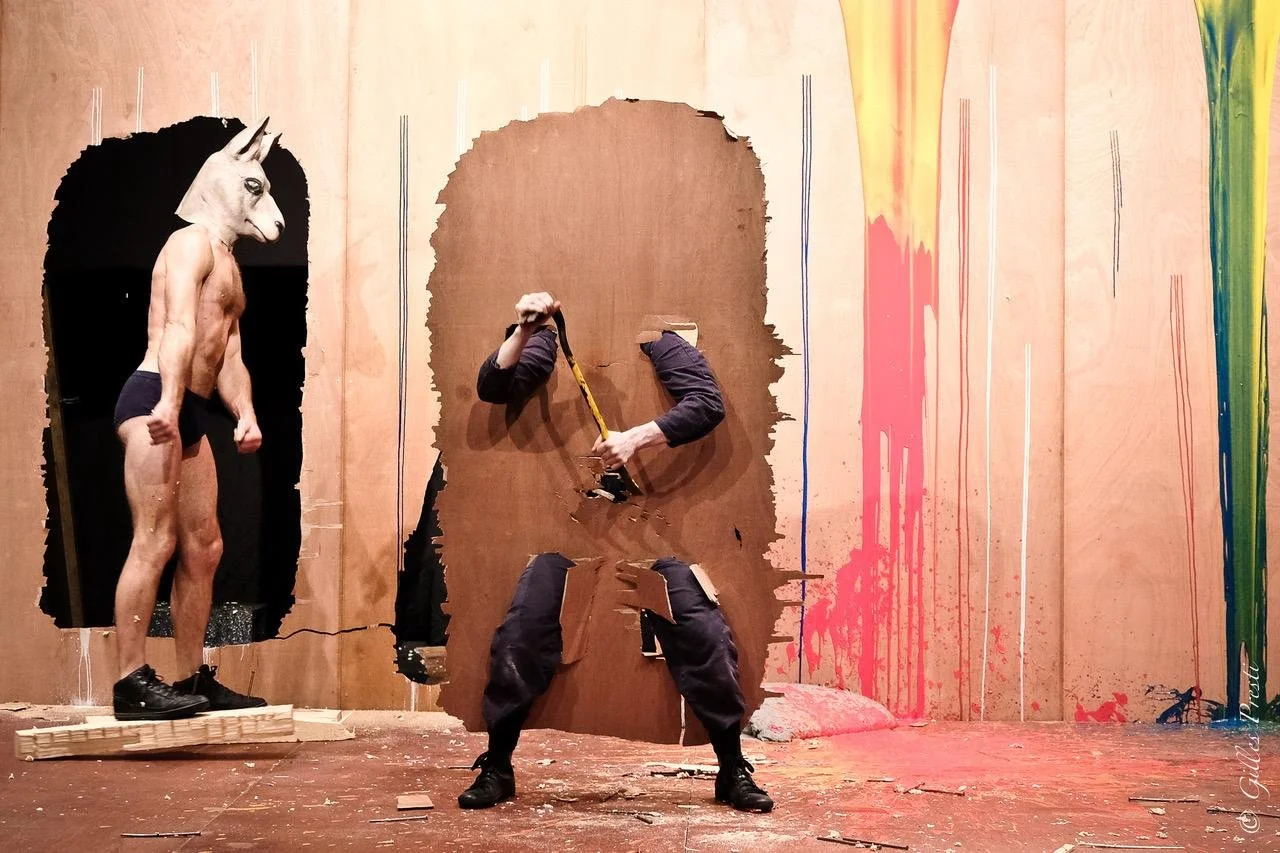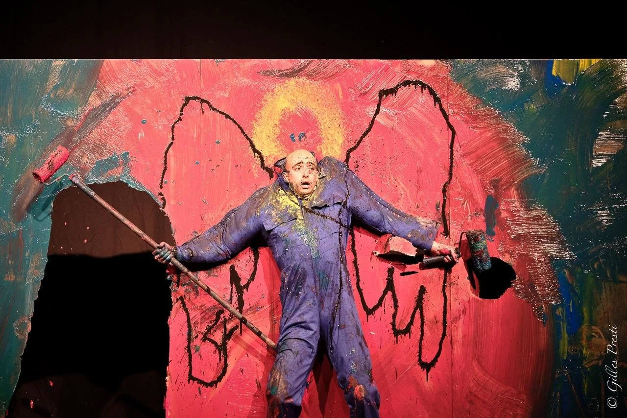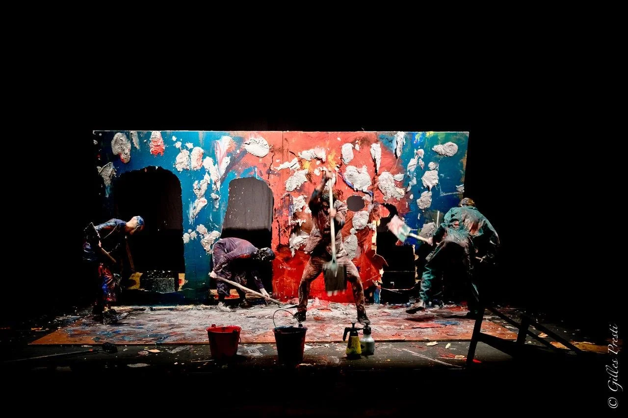 MANZI : Pour ce genre de prestation, j’avoue que je mets en berne ma réflexion même si certains peuvent y déceler une allégorie franchement golri de l’espèce humaine avec son pouvoir d’autodestruction et sa capacité d’adaptation. Je te rejoins complètement sur la dimension dadaïste de ces actions même si l’appellation « cirque » a pu dérouter certaines familles, peu familiarisées à l’absurde. Work, c’est la rencontre incongrue de Charlie Chaplin et de David Lynch à Leroy Merlin. Le chaos proposé est une attraction circassienne totale avec une vraie tension liée à la gestion de la gravité, de l’humour avec des vols planés savamment exécutés par des clowns aliénés, de la poésie avec ce panneau peinturluré ondoyant et une ménagerie complètement zarbi. J’ai adoré la chronologie chromatique, très bien restituée ici par les superbes photographies de Gilles Presti. Après un début plutôt lent, qu’as-tu pensé de cette accélération dramaturgique complètement hystérique, digne des Chiens de Navarre option Arts Plastiques?