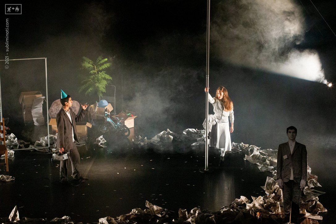 Après avoir fait mon précieux en vous étalant ma confiture de références, je vous avoue que la pièce dont j’attends le plus c’est celle-ci. Pourquoi ? Primo, le bordel sur la photo. Secundo, c’est souvent au K qu’on assiste aux représentations les plus déjantées. Tertio, le texte de présentation vantant humour et poésie légère a tout pour me plaire vu que je viens déjà de terminer Samouraï de Fabrice Caro. Quarto, depuis les furieux Tony Clifton Circus (et merde, le gars fait encore son malin), je n’ai pas eu l’occasion d’apprécier des artistes italiens.