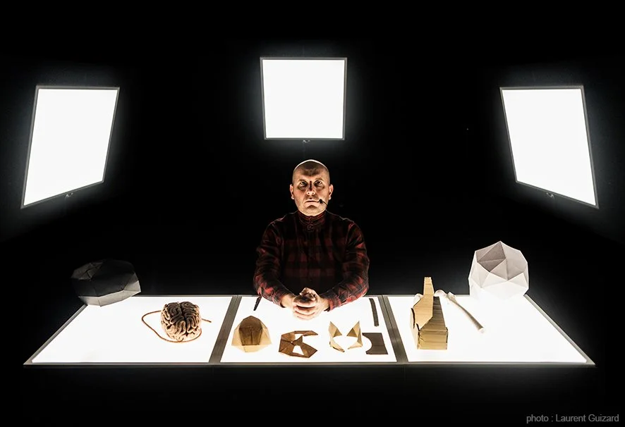 Je ne veux pas trop divulguer les détails de cette brillante création car il est important que chacun construise sa propre interprétation, selon sa sensibilité et les détails observés. Sachez que ce travail est d’une esthétique clinique, contrebalancée par l’utilisation de matières plus familières. Ce brouillamini d’analogique et de numérique, d’origami substantiel et de réalité virtuelle incarne à merveille cet humain de demain, ce remplaçant peu convaincant. Les effets sonores interfèrent avec une rare précision et la gestuelle du marionnettiste est parfaitement synchronisée, même quand son visage se trouve dissimulé sous des masques aussi élégants qu’inquiétants. Quand un objet choit, c’est évidemment un choix. Plus besoin de discours pour se diriger vers l’issue de secours de ce transhumanisme souffrant déjà d’anévrisme.