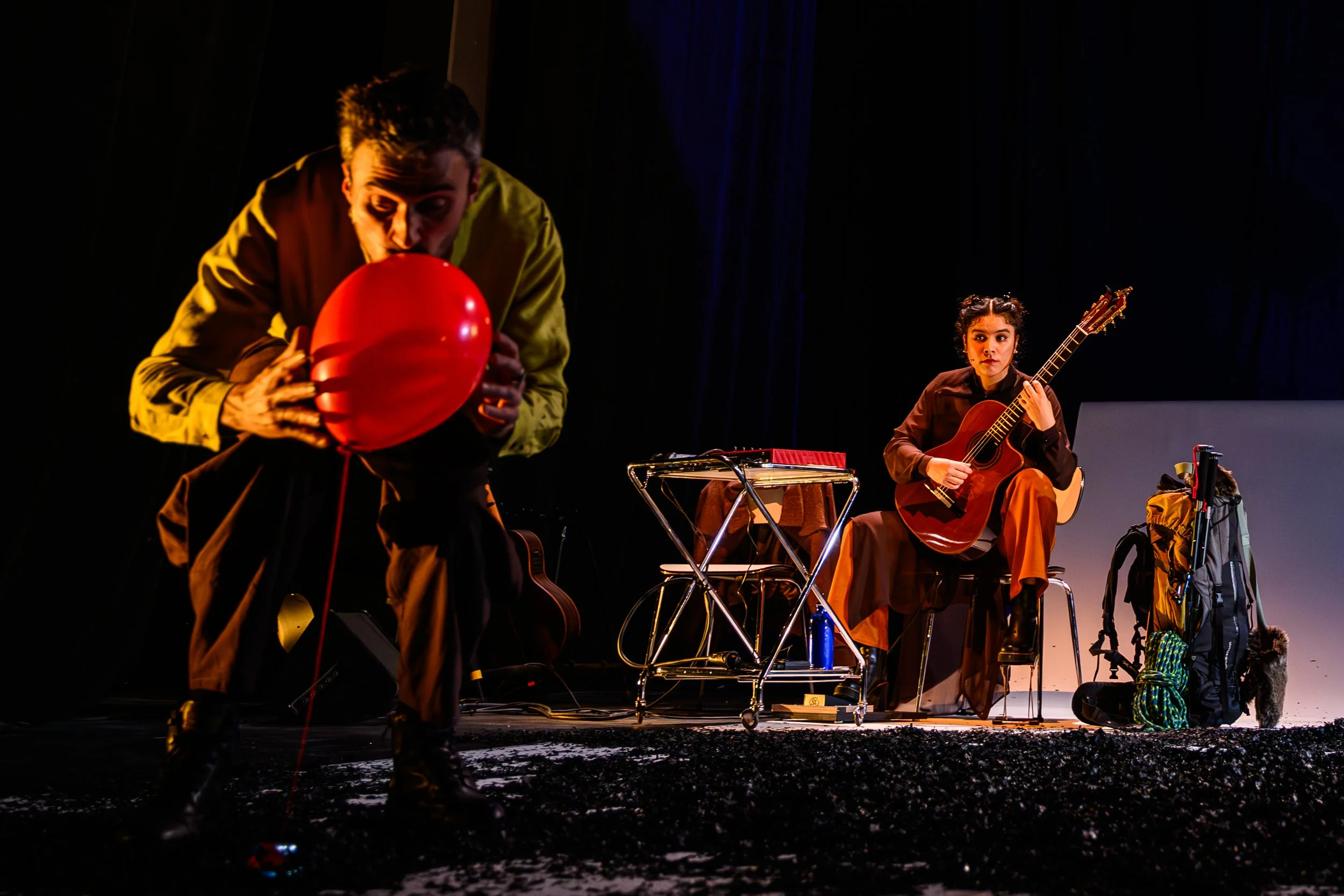 Nelly : Un coup, je parle et fais des phrases longues, un coup, je hausse la voix jusqu'à crier pour espérer donner de l'intensité à un texte dont je t'ai dit avoir trouvé l'écriture limitée. Puis, je reprends ma narration en marchant sur le fil et on boucle par un morceau de la musicienne au jeu de guitare et à la voix assurément belle. Et on recommence ainsi toute la pièce. Ici, la musique n'est pas là pour ponctuer un propos ou le laisser cheminer chez le spectateur mais pour tenter de combler l'absence de capacité de l'acteur à créer l'émotion, à embarquer le public. Le truchement ne fonctionne pas et c'est bien dommage pour la musicienne au talent indéniable.
