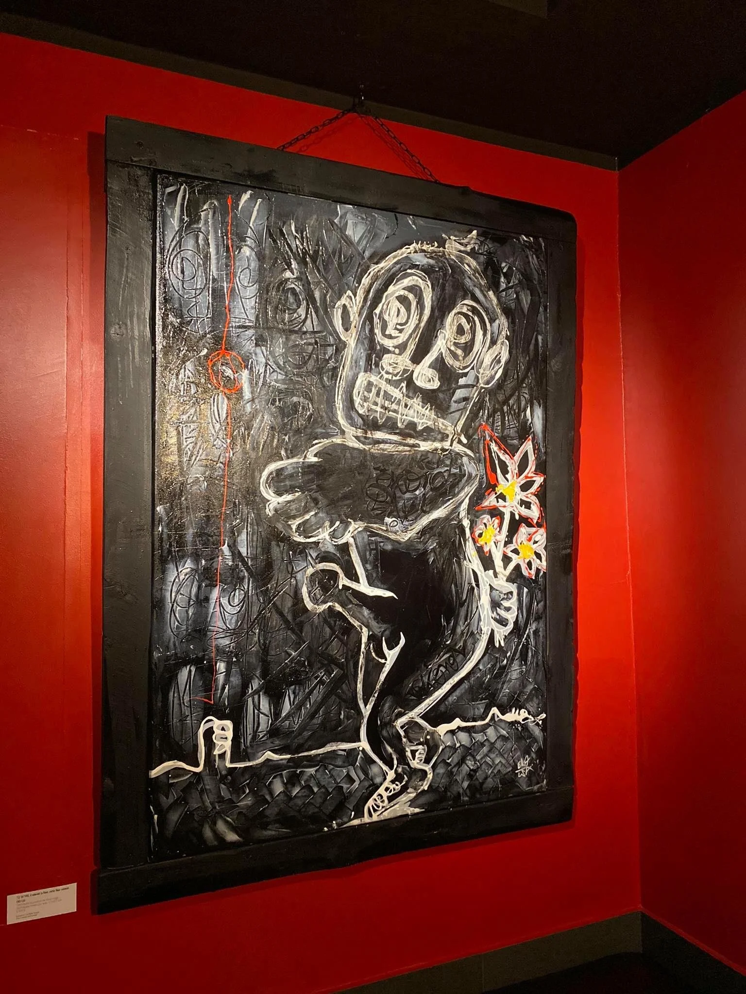 Force est de constater qu’hier soir, les artistes furent détrônés par l’imaginaire collectif, cavalant dans cette maison de la tentation avalant toutes les attentions. Les tableaux, vampirisés par les fantasmes projetés, avaient bien du mal à s’imposer. Pourtant, côté inventivité, ils n’avaient pas lésiné. Derrière un mur de glory holes devenu confessionnal, Laurent Segelstein déclamait un verbe libidinal. Dans les alcôves grenat, des tableaux appât. Corps encastrés sur une planche sans roulette, collage de levrettes, Ago était en fête. Dans le sauna, une robe couture moitié tissu moitié chevelure offrait une fascinante texture. Au détour d’une cloison, la toile géante de Samuel Perche, impose un visage tumescent. Oui, ce fut saisissant.
