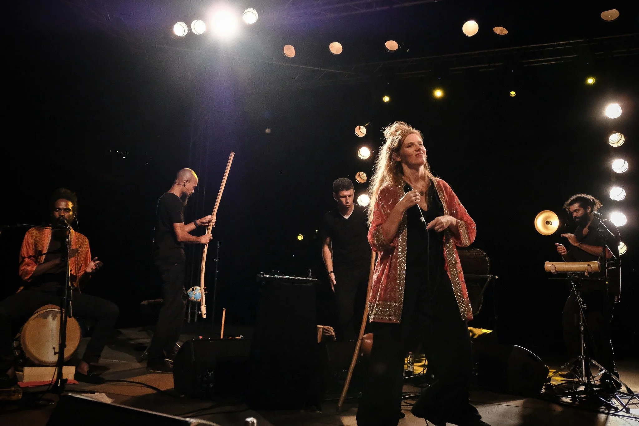 Si la base de maloya est toujours revendiquée, la tribu s’est étoffée et l’apport des nouveaux musiciens emporte leur musique vers des horizons moins étiquetés, plus raffinés en affirmant une vraie identité. C’est toujours un bonheur pour les yeux de voir les musiciens changer d’instruments – kayamb, bobr, loop, roulèr, doum, sati piker, triangle - à chaque nouveau morceau. Loin d’être anecdotiques, ces rotations évitent le sentiment de répétition surtout quand elles magnifient de riches compositions. La guitare électrique apporte une âme rock à ce registre de musiques du monde et densifie la transe. Ce backing band mouvant, tout de noir vêtu, en impose vraiment et l’équilibre scénique avec les deux artistes féminines est idyllique. Si la Clairvoyante Cellule de Communication du Séchoir a proposé de catégoriser Saodaj comme du « maloya mais pas que », je propose au CCC mon étiquetage plus radical « maloya mais plus que ».