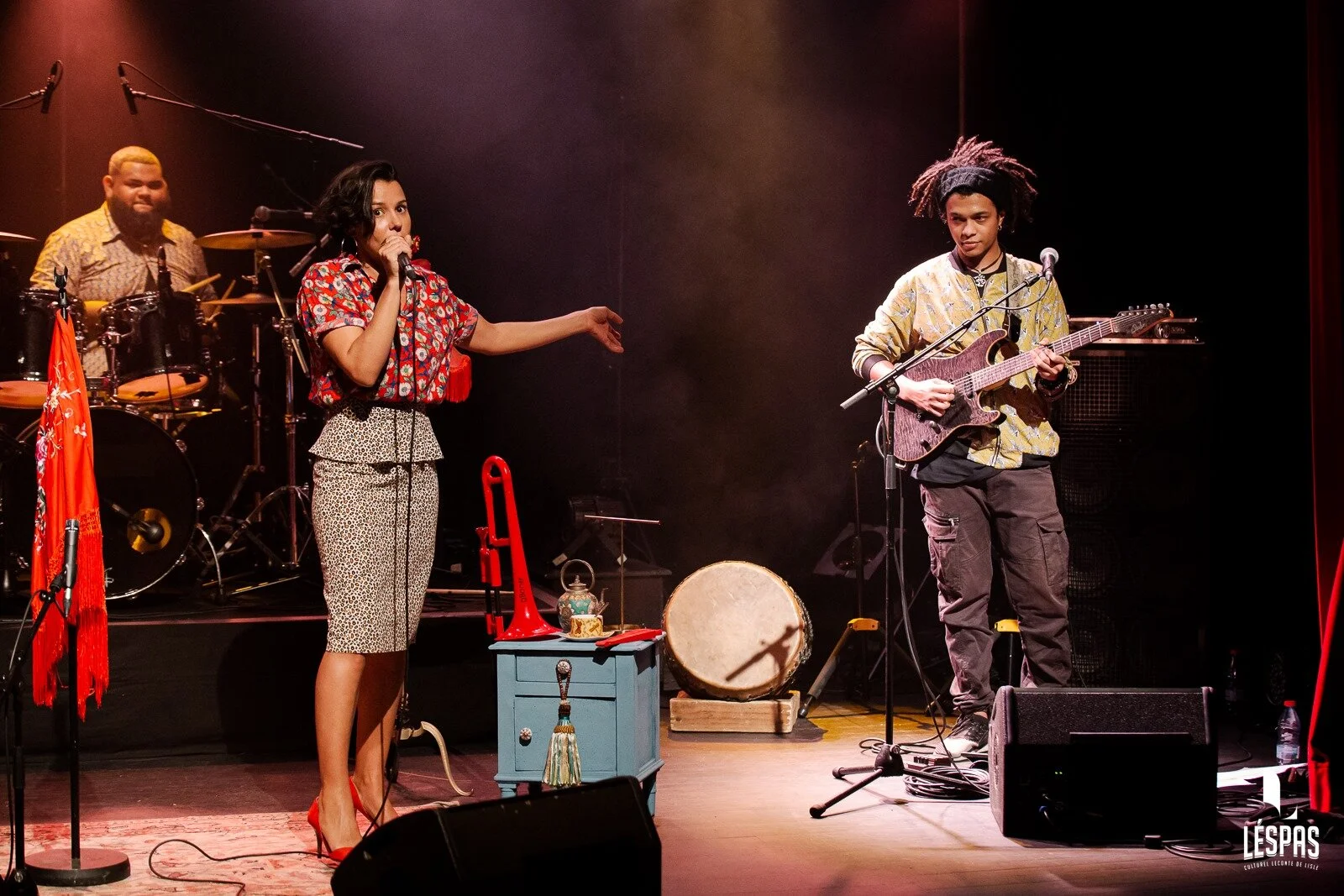 N’attendez pas non plus un stand-up caustique à la  Blanche Gardin mais quel bonheur de voir une chanteuse revendiquer un spectacle total en assumant son statut d’entertaineuse. Ça nous change de ces cantatrices aux relances convenues (Koman i lé La réunion?), aux mines trop austères (la musique c’est sérieux, mec) ou au charisme faussement ingénu (si je me cache derrière ma frange c’est que je suis à fleur de peau). Attention, tout n’était pas parfait dans ce show encore tout chaud : les interactions avec les musiciens fonctionnaient parfois moyen, la rythmique comique a connu quelques hics mais l’entièreté de sa personnalité rattrapait toujours les petits manques de spontanéité.