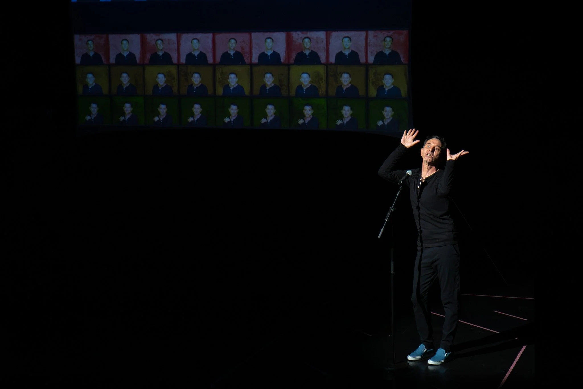 Pour une fois, le teaser de présentation est une accroche chiadée qui entrebâille un univers sans donner toutes les clefs discursives. Jean-Philippe Raymond interprète ses multiples lambdas de façon virtuose (avec un climax lors de la chanson finale, bravo au créateur musical Bebass) pour parler de lui, de son amnésie traumatique, de ses troubles de la dissociation. Ce n’est jamais plombant, c’est parfois déconcertant, c’est souvent éclairant et surtout très émouvant. Sans divulgâcher, j’aimerais également mettre en avant la double incursion des danseurs amateurs qui emportent ce seul-en-scène dans un cyclone de joie, de résilience, d’énergie et d’empathie.