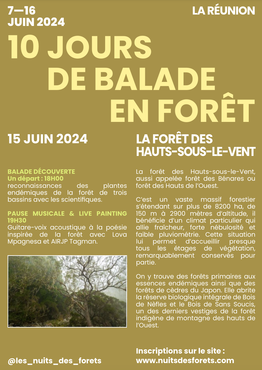 Le programme des Nuits des Forêts à La Réunion vous est enfin dévoilé ! Du 7 au 16 juin, ce sont plusieurs propositions sensibles et scientifiques qui vous attendent dans plusieurs forêts de l'île